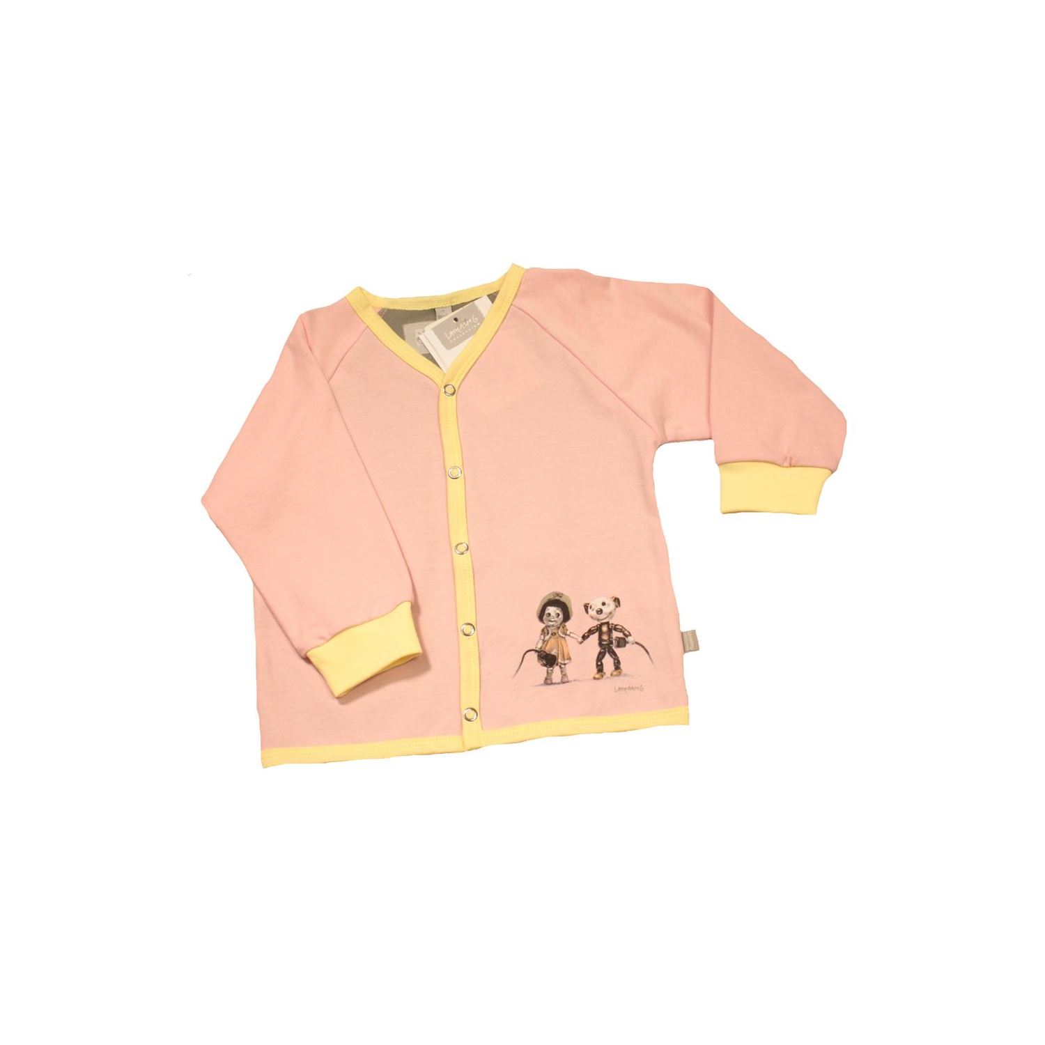 Härlig cardigan med tryckknappar från Lasse Åbergs kollektion närkontakt. "Humor och miljötänk är det bästa vi kan ge barnen" Lasse Åberg Tanken bakom kollektionen Kollektionen andas 1950-tal och lantlig romantik. Den är inspirerad av shabby chic-trenden. Avskalad design lyfter fram de sköna färgerna och Lasses detaljrika illustration. Närkontakt- Träffa två leende vänner som kompletterar varandra, har roligt ihop och trivs i varandras sällskap. Två vänner som passar lika bra ihop som en stickpropp och ett skarvuttag.
